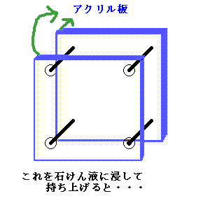 このことは「プラトーの問題」と言われているもので,シャボン膜の表面張力を利用したものなのです。この装置にできた膜は,表面張力によって膜の面積をでき